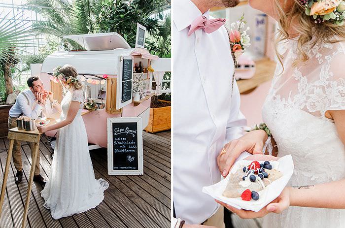 Wenn einer der kleinen „Wohnis“ – in Pastellblau oder Pastellrosa – bei eurer Hochzeit angefahren kommt, gezogen vom kleinen Fiat, dann sagen bestimmt zehn Gäste erst einmal: Oh wie süß! Das gilt auch für das Angebot von Anne Strieder – Crêpes in allen Variationen sowie Waffeln, Kaffee, Popcorn, Zuckerwatte und vieles mehr. Das Crêpes-Portfolio reicht vom Klassiker mit Nutella über Puderzucker oder Zimt und Zucker bis hin zur extravaganten Version mit Pistaziencreme. Aber auch andere Herzenscrêpewünsche werden gerne bedient. Und habt ihr schon die Hochzeitstorte aus Crêpes mit den vielen frischen Früchten gesehen? Lecker!