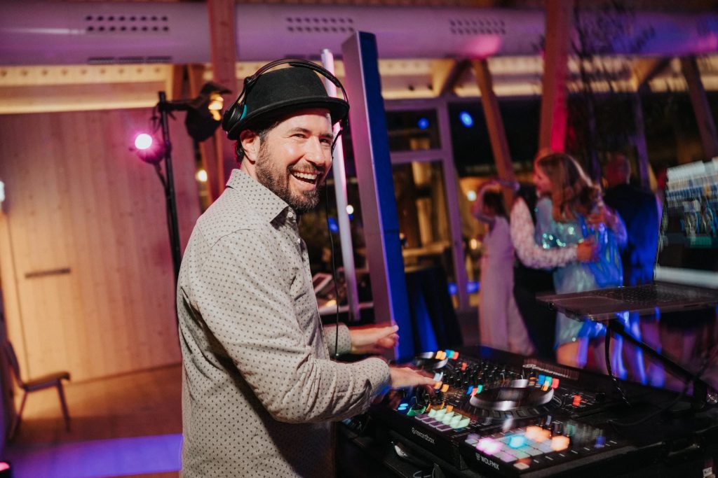 Ein Highlight für mich als Hochzeits-DJ war definitiv der Musikstil, den Andi und Renée sich gewünscht haben: Indie, Alternative und Rock. Diese Genres sind ihre Lieblinge – und meine Aufgabe war es, genau das auf der Tanzfläche zu berücksichtigen und gleichzeitig auch alle anderen Gäste mitzunehmen. Andi und Renée gehören zu den Paaren, die mir für die musikalische Gestaltung des Abends grundsätzlich sehr viel Freiraum gelassen haben. Frei nach dem Motto: Du bist der Profi, mach uns und unsere Gäste partytechnisch glücklich. Verboten waren Schlager und als einzige Must play Songs wurden folgende genannt: